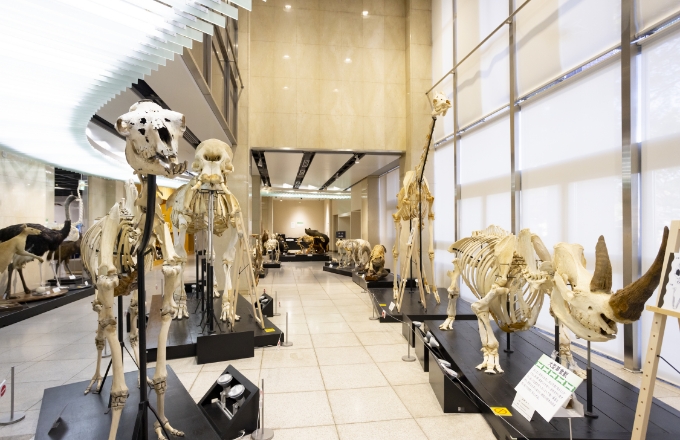 日大生物資源科学部ならではのユニークな施設。「骨の多様性と進化」をテーマとして、陸海空さまざまな動物の骨や骨格に関する資料を収集しています。生物の多様性や進化について学ぶことができます。