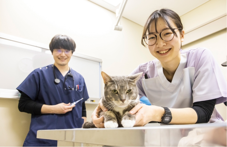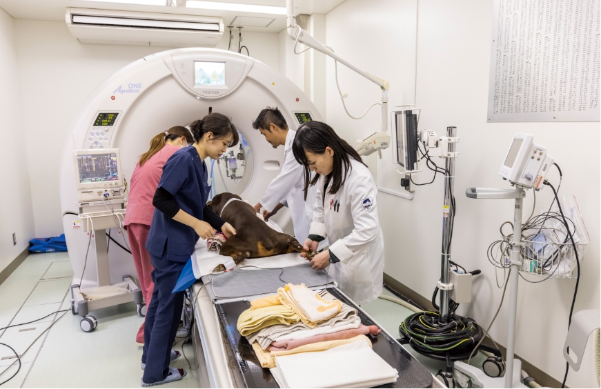 日本大学動物病院(ANMEC)は、動物医療の地域中核拠点であり、獣医学臨床教育や研究の場として活用されています。腫瘍などの病気を的確に診断する高性能なCT装置やMRI装置、腫瘍を治療する放射線治療装置など、高度な医療機器を備え、獣医学科や獣医保健看護学科の各種実習など、獣医療・動物看護の実践的な学びの場としても活用されています。