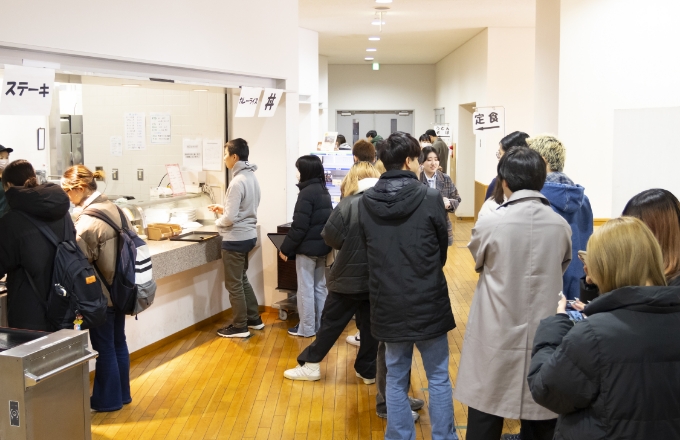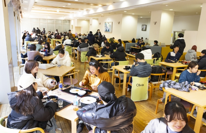 本館地下一階にある学食「オリビア」。コスパが良く、栄養バランスが考えられた料理が特徴。日替わり定食、ラーメン、牛ステーキ、ネギトロ丼などメニューも豊富です。広々とした座席でソファー席もあり、友達とゆったり過ごすのにもぴったりです。