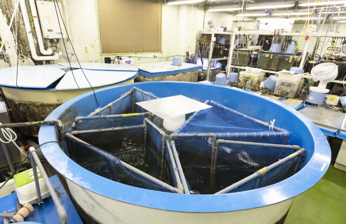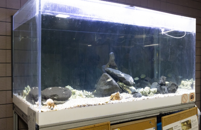 10号館には水槽が複数あり、様々な魚介類たちが種類ごとに分けられて飼育されています。授業の合間や一息つきたい時に、これらの水槽で泳いでいる魚達を見たり、水槽の音を聞いたりして癒されています。中でもウナギの水槽がお気に入りで、見ていると無心になれます。
