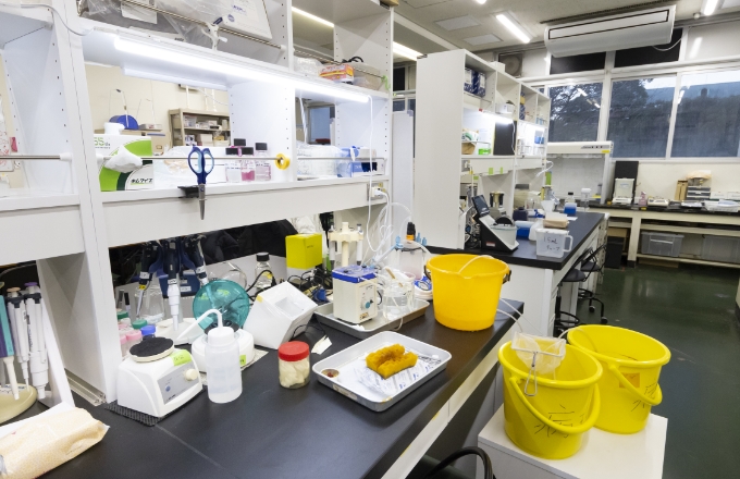 キャンパス内には各学科の授業や研究に利用される学科特有の建物が数多くあります。実験室や研究室などを備え、専門的な設備が整っています。また、研究所や研究センターなども備え、先端分野の研究・開発にも取り組んでいます。10号館は海洋生物学科と森林学科の研究室がある建物でエントランスの大きな水槽が印象的です。